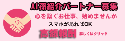 ※現在、AI孫紹介パートナーを全国で募集中です。 詳しくは 公式ページ をご覧ください。 会社概要 プライバシーポリシー 特定商取引法に基づく表記 copyright ©株式会社AI孫 All rights reserved. .
